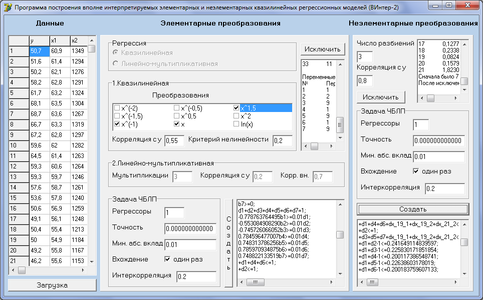 Программа построения вполне интерпретируемых элементарных и неэлементарных квазилинейных регрессионных моделей